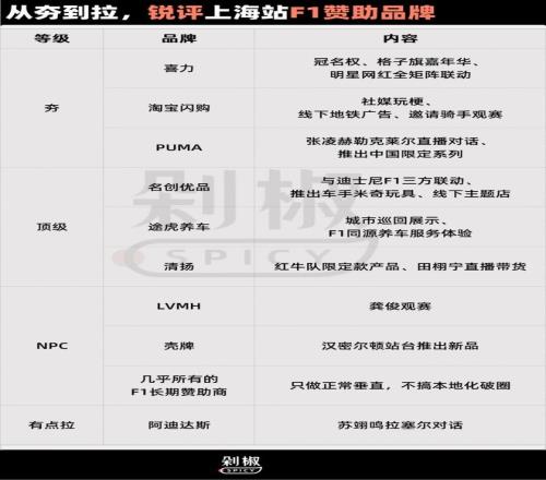 據此,剁椒Spicy在F1上海站尾聲觀察,推出一份純主觀的從夯到拉銳評F1中國區品牌合作贊助效果列表。評價標準分別是:話題出圈度,品牌形象塑造和本地化策略高明度。