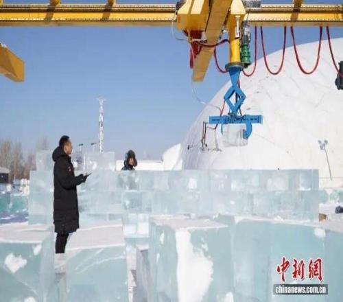 2月3日,在第二十七屆哈爾濱冰雪大世界的“科技賦能冰雪實驗區”內,智能自動化標準冰砌塊生產線已初步形成,從冰塊切割塑型到自動搭建均進入現場測試階段。中新社發 趙宇航 攝