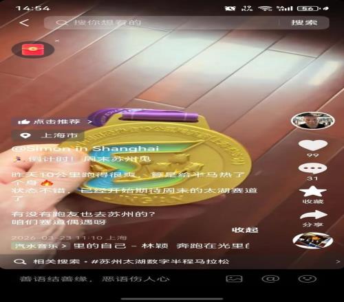 上周六,中國10K上海靜安站的賽道上,西蒙沖過終點后沒有急著看成績,而是掏出手機對著獎牌拍了張照,順手發(fā)了一條抖音:“10公里跑得很爽,算是給半馬熱了熱身。有沒有朋友也去跑太湖賽道的?咱們偶遇呀。”