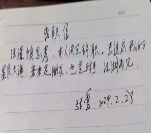 張雪在朋友圈曬出的辭職信