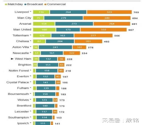 曼聯近年來雖然戰績不佳,品牌還在,跟利物浦確實是兩家豪門,商業贊助收入都在3.2億-3.3億這個區間,阿森納后面會逐步追上來。