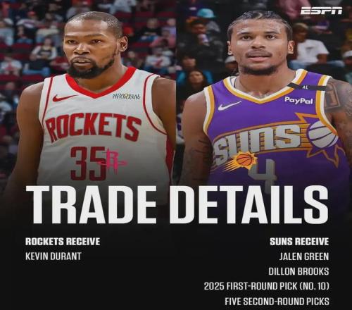 去年夏天休賽期,火箭送出杰倫格林+狄龍+25屆首輪第十號簽(馬盧阿奇)+5個次輪簽,從太陽挖來杜蘭特。