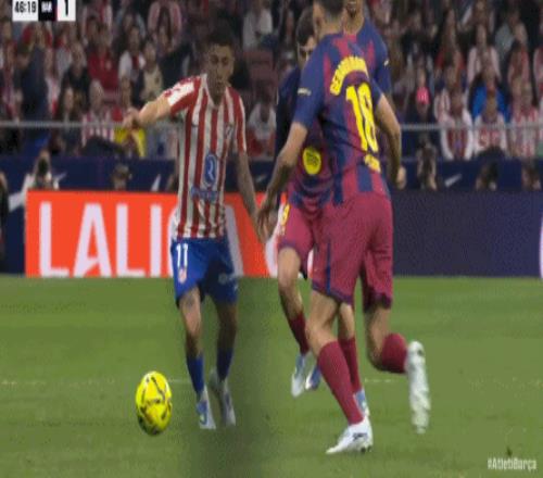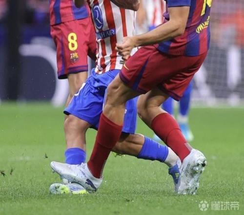 第一個場景:巴薩球員與馬競球員爭搶一個五五球,雙方都有明顯機會觸球??完犌騿T率先趕到并踢到皮球,但在后續動作中,鞋釘踩到對手小腿側面、腳踝上方位置,還造成對方關節扭轉。主裁判當場綜合動作強度、撞擊部位以及后果,以嚴重暴力犯規直接出示紅牌。隨后在VAR建議回看后,改判為黃牌。
