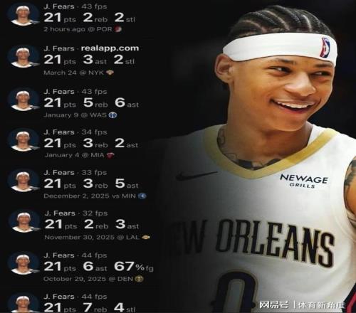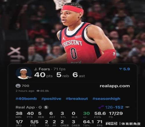 不過今天最耀眼的還得是費爾斯這個"數據怪獸"。這位新秀前腳剛打破生涯得分紀錄(此前最高28分),后腳就轟下40分5板6助3斷的恐怖數據,正負值+30更是夸張到離譜。最絕的是他的得分分布:29投17中,三分7中1,罰球5中5——這哪是得分后衛啊,分明是穿著21號球衣的"中距離魔術師"!看著費爾斯在場上各種急停跳投,我突然明白為什么鵜鶘球迷現在管他叫"人類21分精華"了——因為這哥們兒今天之前單場最高分才28分啊!