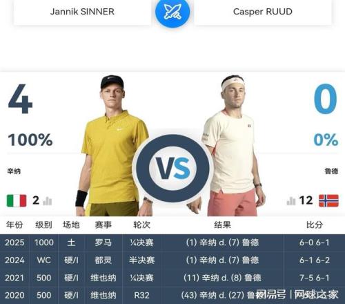 盡管職業(yè)生涯至今魯?shù)滤膽?zhàn)全負(fù)于辛納,其中去年羅馬大師賽1/4決賽,更是兩盤僅得一局,以0:6 1:6的懸殊比分慘負(fù)。但是魯?shù)录t土底蘊深厚,紅土戰(zhàn)法諳熟于心,辛納要想再次過關(guān),并非易事。
