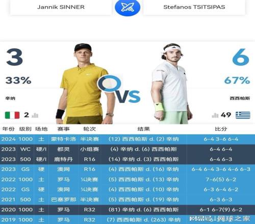 本周蒙特卡洛大師賽,辛納奪冠道路荊棘密布,步步艱辛。首輪輪空之后,辛納第二輪首戰(zhàn)法國左手將安貝爾,應(yīng)該過關(guān)無虞;第三輪1/8決賽可能對陣希臘海盜西西帕斯,難度急劇上升。西西帕斯雖然現(xiàn)在世界排名已經(jīng)滑落到40開外,但他曾經(jīng)三奪蒙特卡洛大師賽冠軍(2021、2022、2024年),一次闖進法網(wǎng)決賽(2021年),乃是公認(rèn)的95后紅土頂尖高手。兩人職業(yè)生涯至今交鋒九次,西西帕斯六勝三負(fù)領(lǐng)先,其中紅土交鋒戰(zhàn)績更是四勝一負(fù)領(lǐng)先。2024年蒙特卡洛大師賽半決賽,正是西西帕斯三盤戰(zhàn)勝辛納,粉碎了辛納職業(yè)生涯首次闖進紅土大師賽決賽的夢想。