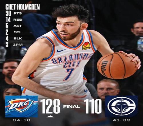 這場比賽,雷霆球星切特霍姆格倫打出了本賽季最佳之一:全場出戰(zhàn)31分鐘,投籃13中10,三分4中3,罰球10中7,得到30分14籃板5助攻。