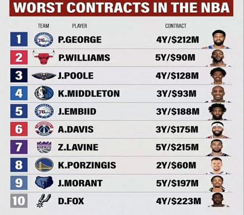 高薪合同最坑人的地方,從來不是球員偶爾拉胯一兩場,而是球隊把整支球隊的未來都壓了上去,結果幾年復幾年,產出、健康和戰績這三樣東西,就沒見它們同時在線過。喬治的4年2.12億、恩比德的3年1.93億、威廉姆斯的5年9000萬,再加上莫蘭特的5年1.972億,這幾筆巨款擺在一起,爭議點其實一目了然:錢是按頂級核心給的,但表現卻沒能一直穩在核心檔位??纯磾祿?,喬治在76人至今場均16.5分、5.4籃板、4.0助攻;恩比德場均27.6分、10.8籃板、3.7助攻;威廉姆斯在公牛這么多年,場均也就9分、4個籃板左右;莫蘭特生涯場均22.4分、7.4助攻、4.6籃板。