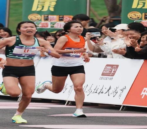 吐完接著跑。第一次停頓了一小會兒,第二次停頓得稍微多了一點。她一直想著往前沖,前面帶跑的人告訴她,后面的人要上來了。她不想被超。等再回頭看的時候,李春霞已經沖上來了。她有點頂不住了。沖過終點,2:34:10(槍聲成績2:34:19),國內女子第三,PB了7分多鐘。