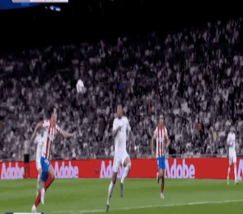 第42分鐘,卡瓦哈爾邊路傳中,姆巴佩高高躍起頭球擺渡,維尼修斯門前被動頭球,錯失良機。