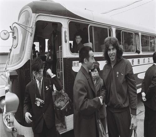 1971年4月,日本名古屋,第31屆世乒賽期間,透過關閉的車窗拍攝到美國男選手格倫·科恩(右一),當年19歲的他誤打誤撞上了中國隊的班車。視覺中國 圖