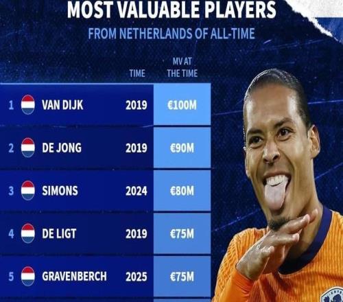 北京時間10月13日,德轉統計出了荷蘭球員歷史身價榜,2019年身價曾經達到1億歐元的范戴克排名第一,弗朗基-德容9000萬歐元排名第二,哈維-西蒙斯8000萬歐元第三。德轉統計荷蘭球員